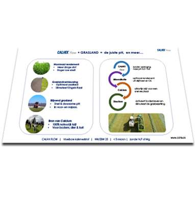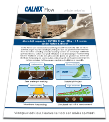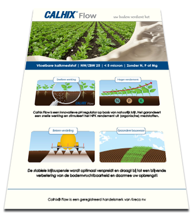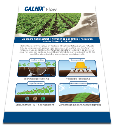 Calhix Flow is een innovatieve en vloeibare kalkmeststof op basis van natuurlijk krijt. De micro partikels zorgen voor een snelle pH werking en stimuleren het rendement van de (drijf) meststoffen. Door de betere verdeling in de bouwvoor geeft het een optimale beschikbaarheidvoor de plant en draagt het bij tot een blijvende bodemvruchtbaarheid.